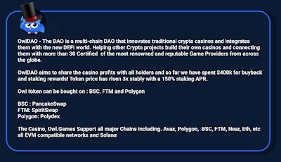 OwlDAO is a multi-chain DAO that aims to innovate traditional crypto casinos to integrate with the new DeFi world. Partnering with leading protocols, helping Crypto projects build their own casinos, and connecting them with more than 30 Certified Game Providers to offer more than 3000 games.